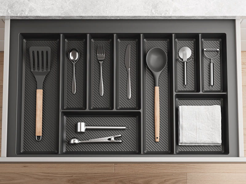 Organizery MAX wykonane są z wysokiej jakości tworzywa o grubości 2 mm, przy użyciu technologii formy wtryskowej, co przekłada się na ich solidność i odporność na uszkodzenia. To inwestycja na lata, która łączy w sobie estetykę, trwałość i wygodę codziennego użytkowania. Wybierając wkłady MAX, zyskujesz nie tylko idealnie uporządkowaną szufladę, ale też większy komfort pracy w kuchni i spójną, nowoczesną aranżację wnętrza.