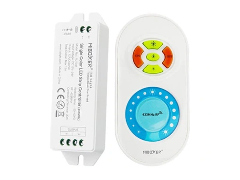 Ściemniacz radiowy MiLight FUT041 z dotykowym kołem wyboru poziomu jasności. Do taśm Jednokolorowych - możliwość ściemniania, rozjaśniania skokowo (3 poziomy jasności) lub płynnie (50 poziomów), włączania, wyłączania. DC 12V 2x6A, komunikacja radiowa 433Hz z pilotem, sterownik w aluminiowej obudowie. Do sterownika można podłączyć np. : do 30m taśmy 3528 60 diod/m (2x15m) lub do 10m taśmy 5050 60 diod/m (2x5m). Sterownik posiada dwa alternatywne podłączenia do zasilacza : poprzez wtyczkę 5,5x2,1 mm lub przewód dwużyłowy.
