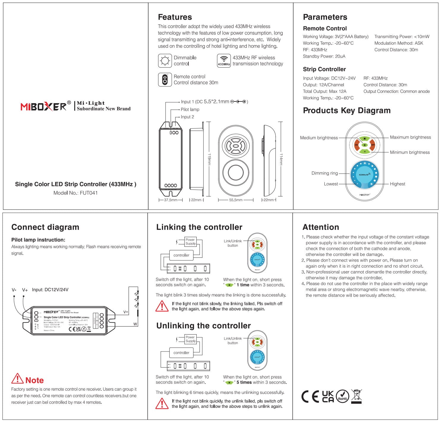 - Częstotliwość komunikacji pilota z kontrolerem: 433Hz