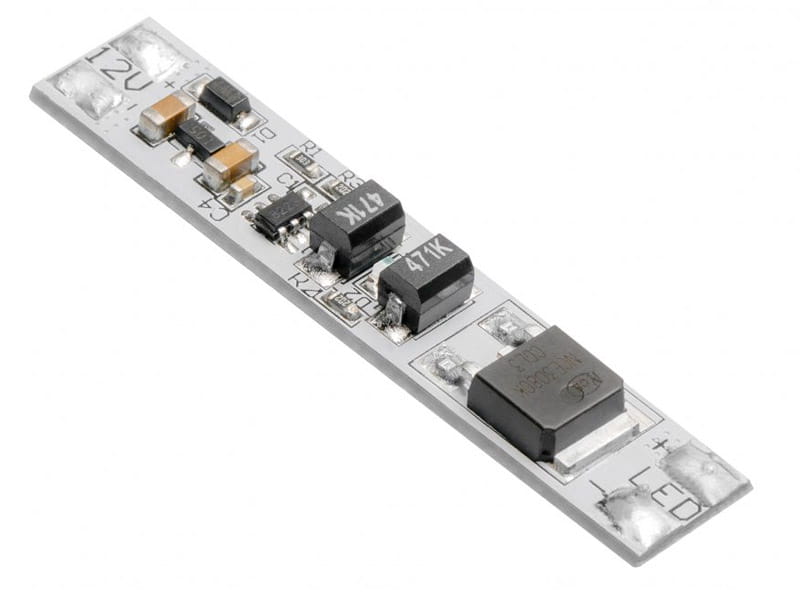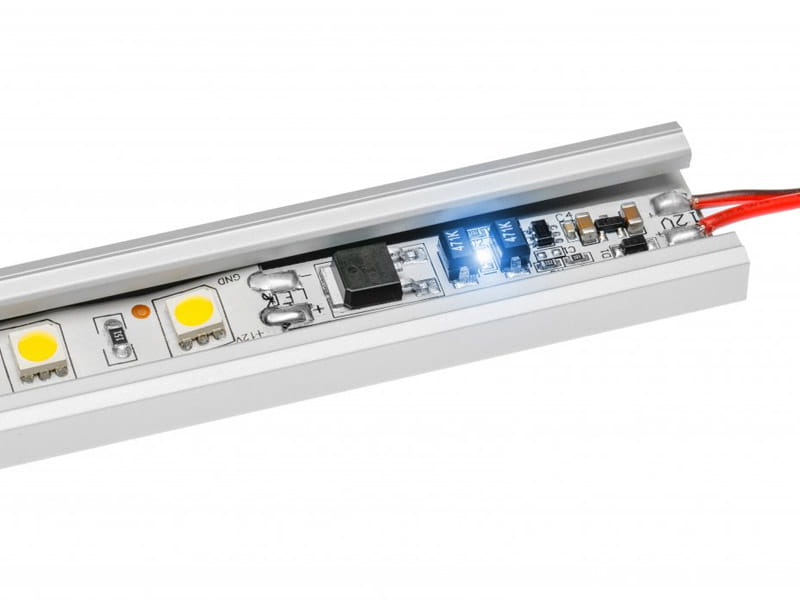 Bezdotykowy włącznik przeznaczony do montażu wewnątrz profilu, który obsługuje taśmy LED o mocy do 60W. Włącznik nie posiada funkcji ściemniania. Gotowość do pracy sygnalizowana jest przez niebieską diodę, która ułatwia zlokalizowanie włącznika w ciemności. Należy unikać podłączania włącznika pod napięciem. Pierwsze uruchomienie urządzenia powinno odbyć się przy założonej osłonce ochronnej.