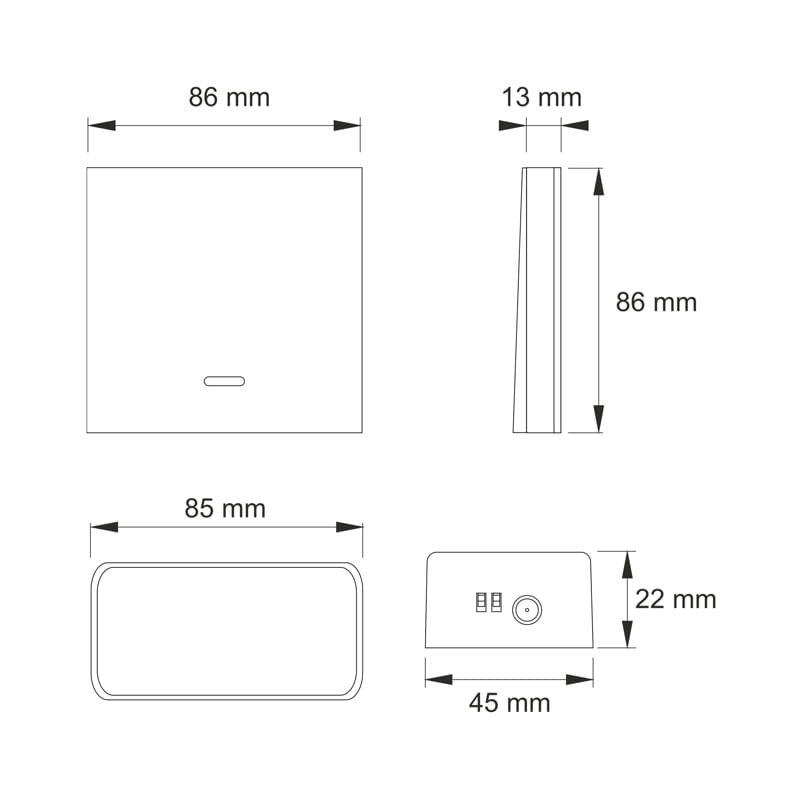 - Wymiary Wyłącznik 86/86/12mm Sterownik 45/22mm