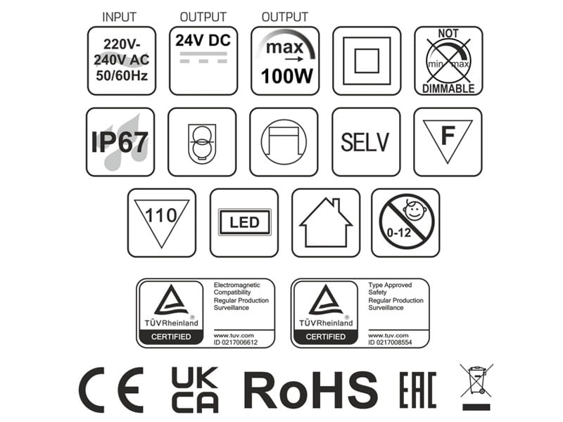Urządzenie zasilane jest napięciem sieciowym 220–240V AC (50/60Hz) i przetwarza je na napięcie stałe 24V DC. Przeznaczone do zasilania oświetlenia LED o łącznej mocy do 100W.